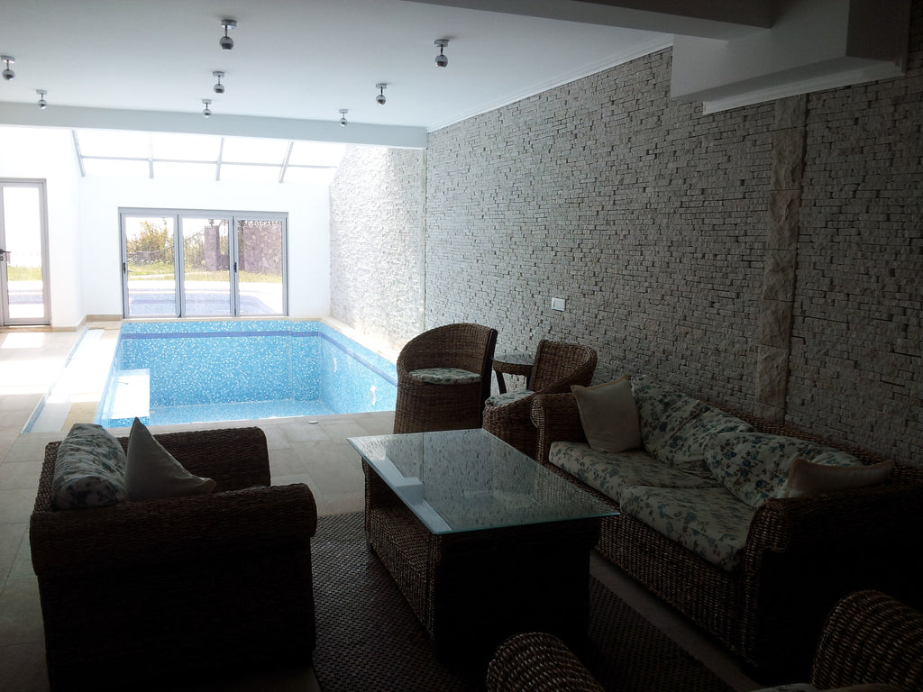 Вилла полностью укомплектована качественной мебелью и техникой (кондиционеры в каждой из комнат, холодильник, электро-плита с духовкой, посудомоечная и стиральная машины). На данный момент одна из гостиных не меблирована (будет установлен диван, обеденный стол со стульями).